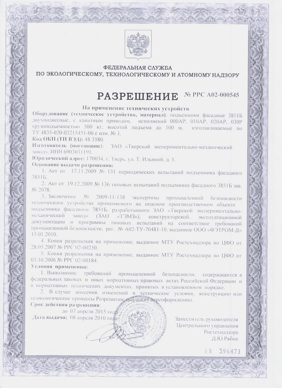 Фасадный подъемник 3851-Б-000А (люлька строительная) с неразборным каркасом предназначен для подъема рабочих и выполнения отделочных работ при ремонте и строительстве зданий и сооружений. Фасадный подъемник комплектуется консолями с вылетом 0,9м, 1,5м и 2,5м., переносным и стационарным пультом управления; лебедками, канатом и кабелем. Высота подъема фасадного подъемника до 100м. Консоли К-0,9, К-1,5 и К-2,5 комплектуются бетонными контргрузами.